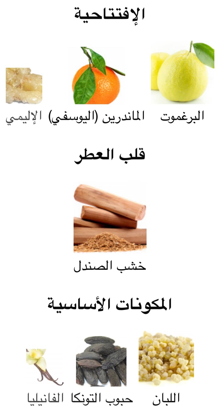 خشب صندل ناعم مع فانيليا غنية يلتقيان فوق برغموت نظيف، ليعطي إحساساً ذكياً بالقوة والرقي في آن واحد، مع تطور سلس وثابت.