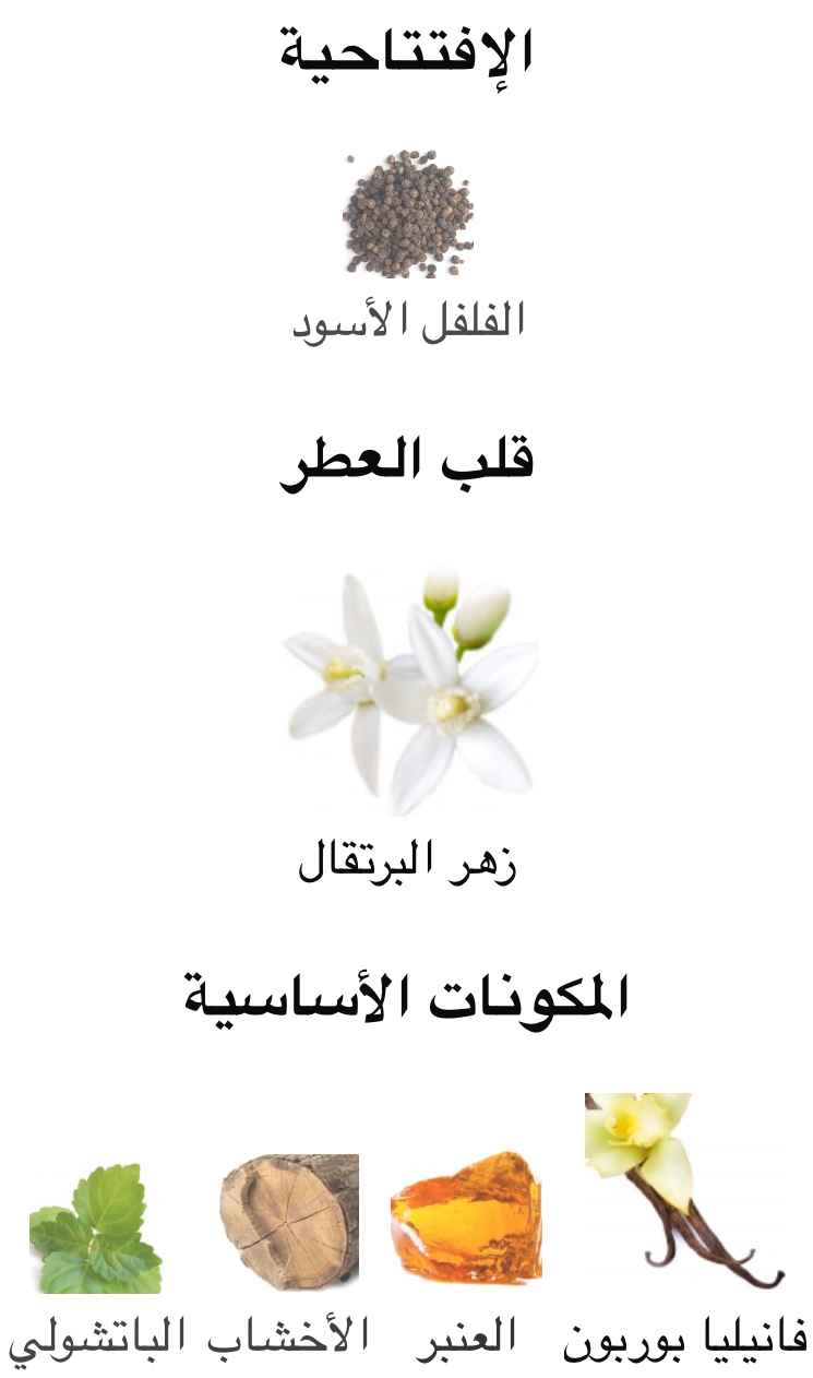 فلفل أسود راقٍ في البداية ينساب إلى قلب زهري ناعم من زهر البرتقال، وتنتهي التركيبة على قاعدة فانيليا دافئة مدموجة مع باتشولي وأمبروكسان بطابع نظيف وثابت.
